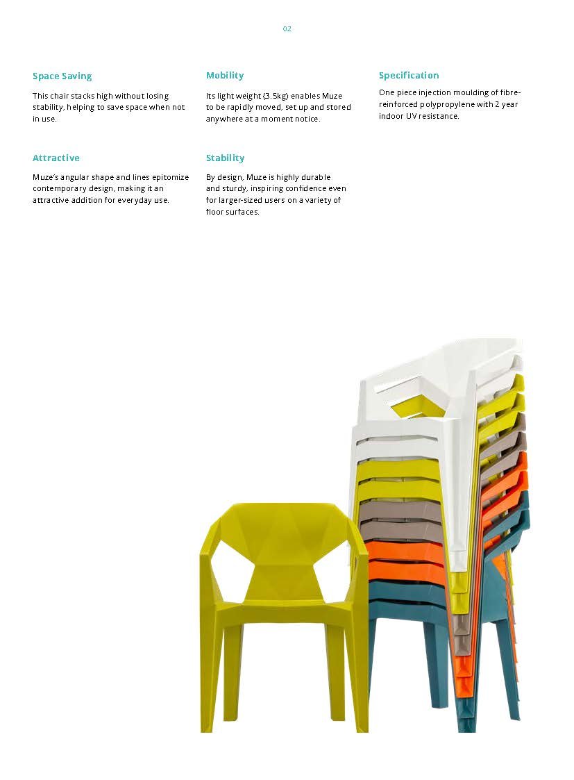 This versatile furniture is suitable for both indoor and outdoor usage. Made of polypropylene resin, it is highly resistant to high impact and harsh weather making it perfect for anywhere. The material also allows for easy cleaning which makes it suitable for venues like cafes, restaurants and rest areas. The Muze will surely make a statement in any contemporary setting, at the same time ensuring comfort, style and practicality.