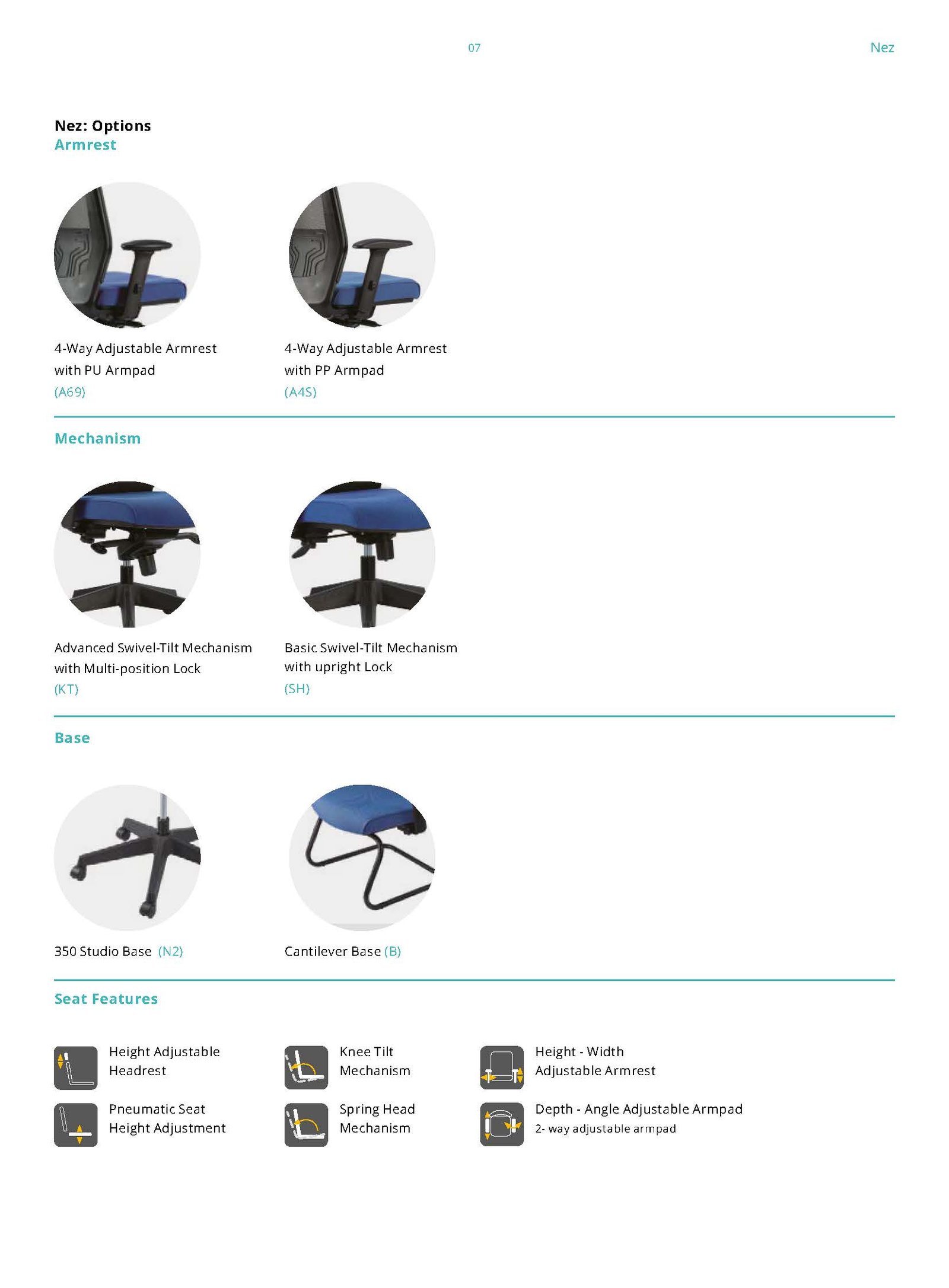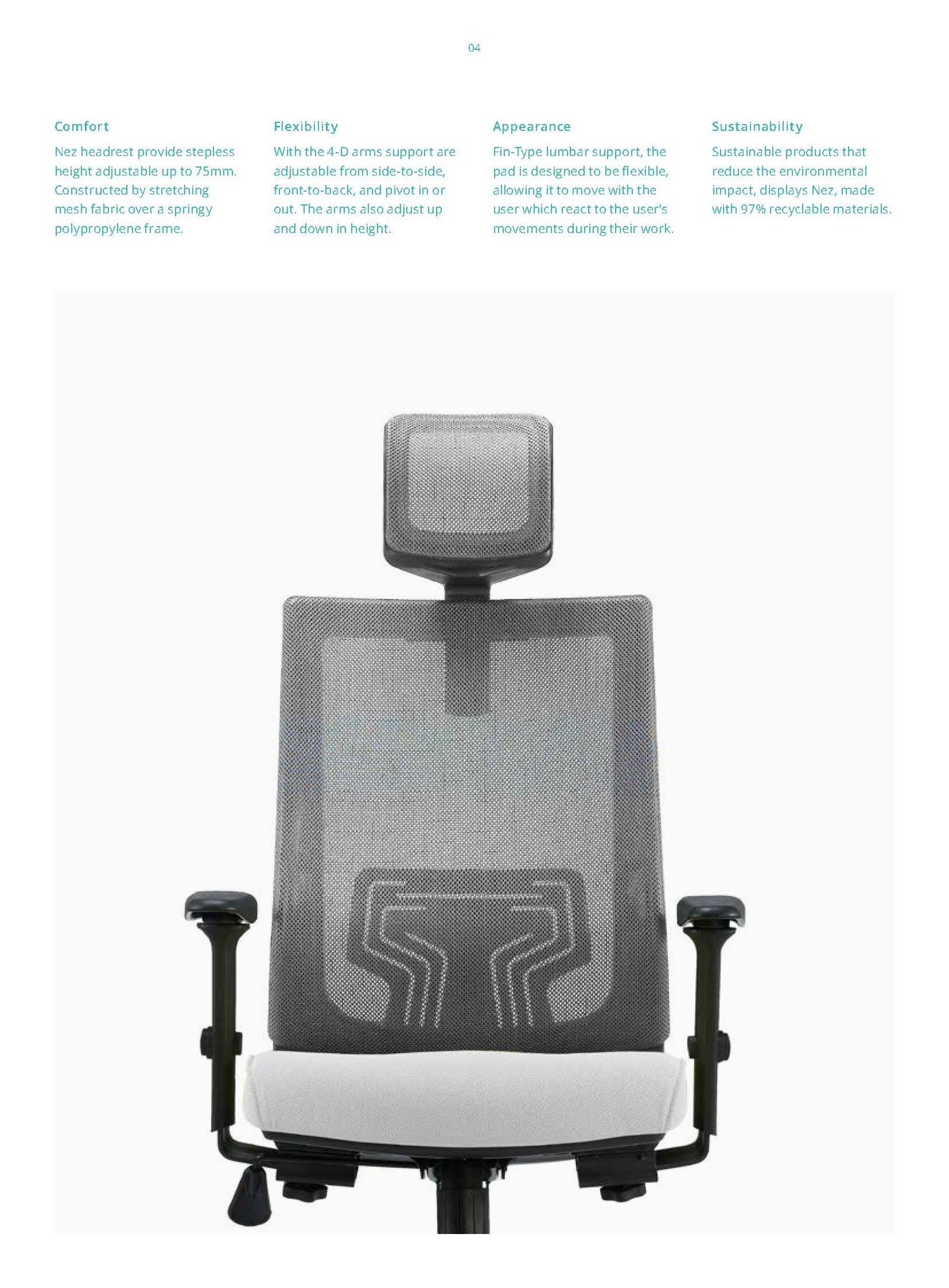 Nez’s flexible back is designed to cuddle your back, following your every movement. The Nez with Fin-type lumbar support will keep you supported in every position, making you feel comfortable throughout the day. The mesh material at the back gives the chair a stylish back side-line.