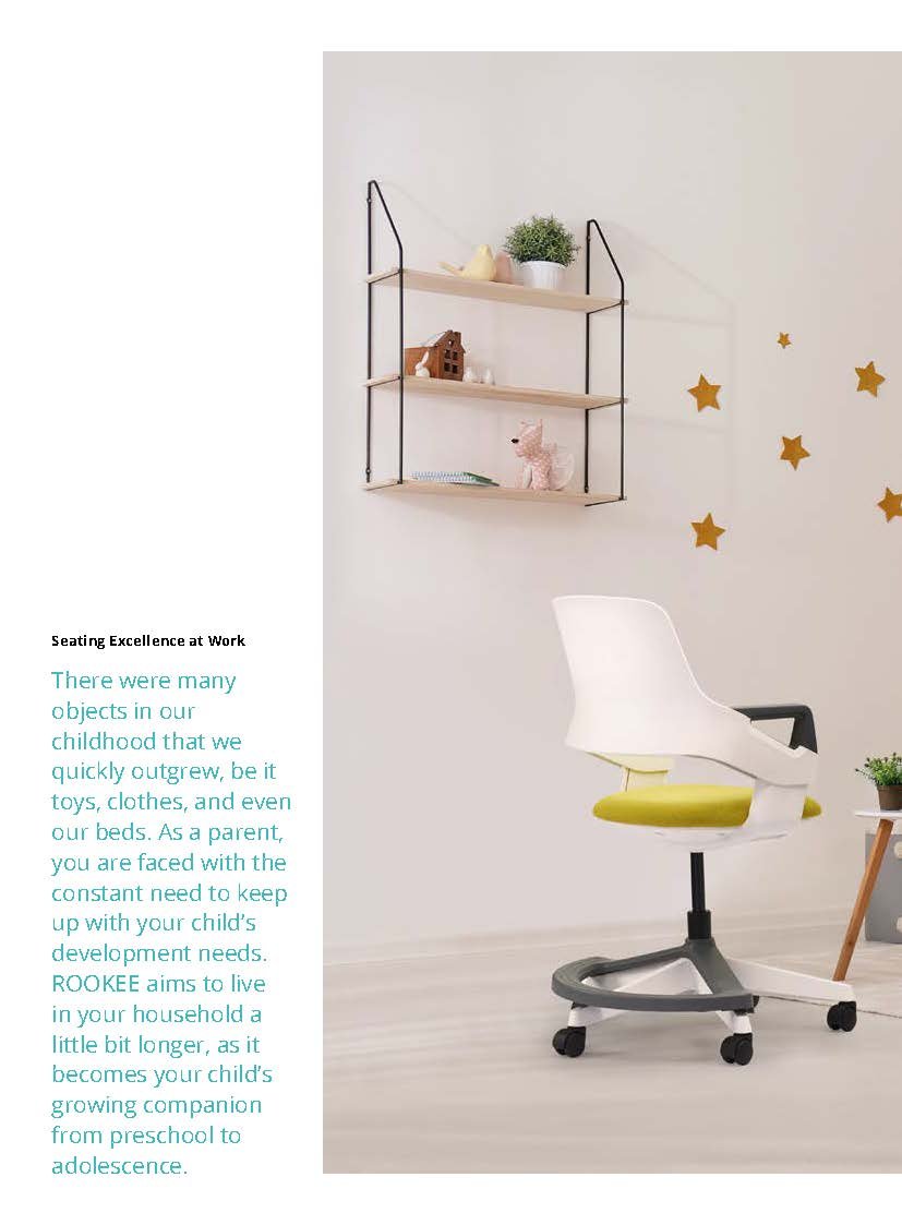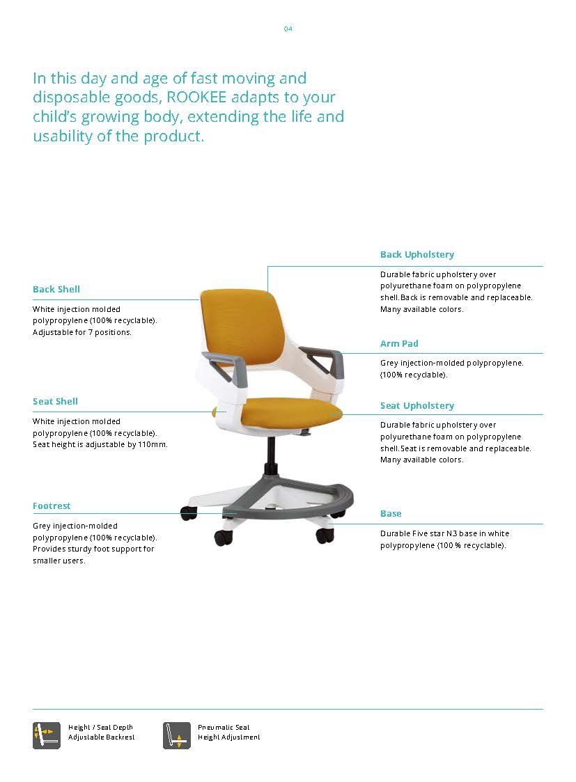 In this day and age of fast moving and disposable goods, ROOKEE adapts to your child’s growing body, extending the life and usability of the product. This chair can be adjusted to suit the child at different stages of their lives, from preschool to adolescence.