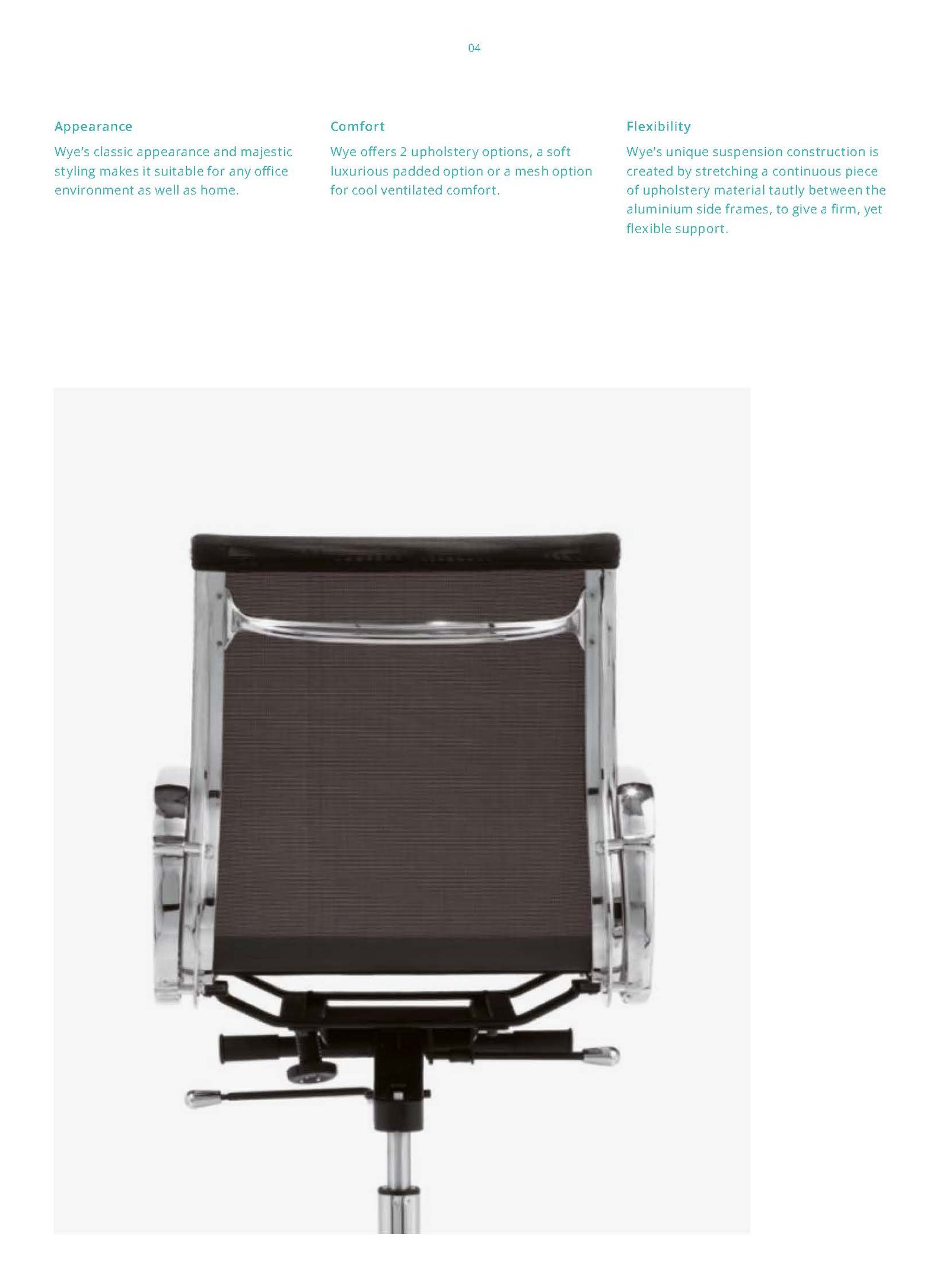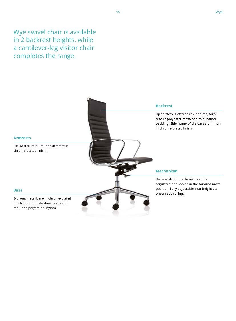Wye’s classic appearance and majestic styling makes it suitable for any office environment as well as home. Wye swivel chair is available in 2 backrest heights, while a cantilever-leg visitor chair completes the range. WYE offers 2 upholstery options, a soft luxurious padded option or a mesh for cool ventilated comfort. The loop armrests and side frames of die-cast aluminium and its 5-prong metal base, all in polished finished combines beauty and durability.